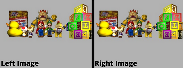 The goal of this exercise is to reconstruct a 3d scene (represented by objects such as a Mario, Bowser, a duck, cubes ...) with only two cameras observing the scene at two different positions.